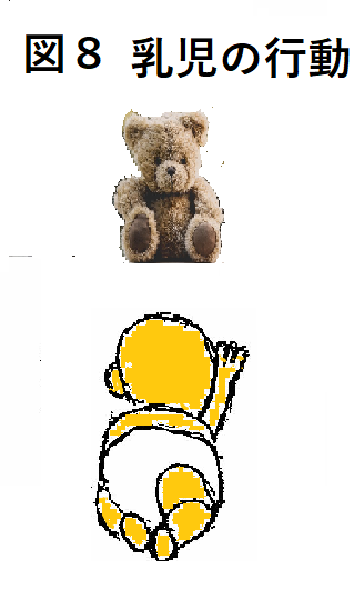 図8に示すように、まだ上手く這うことができないような乳児が、目の前の熊のぬいぐるみを掴もうとして手を伸ばしている状況について考えてみましょう。このときの乳児は手の動かし方にあまり慣れていない、という設定で考えます。