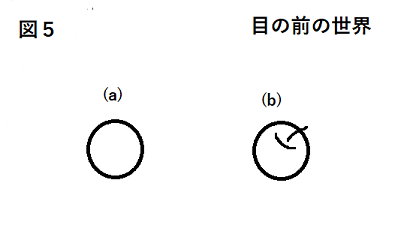 図5(a)をご覧ください。それが円であることはわかるかと思いますが、それ以外、何ら特徴らしいもののない図形が描かれています。そうとは言っても、図形が存在していること自体はもちろん分かると思います。次に図5(b)をご覧ください。先の図に新たな特徴が描き加えられています。それによりリンゴであろうと推測できると思います。つまり、何であるかは分からないものの存在そのものは分かるという低次の認識の段階から、それが何であるかが分かるという高次の認識の段階へと変化したことになります。その背景には「重ね合わせのシステム」が関与し、図形に意味が与えられたことによるのでしょう。