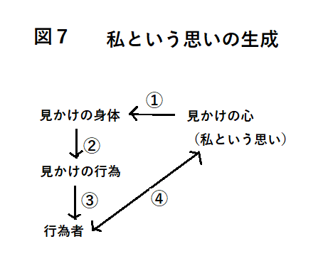C 「行為者」という思いから「見かけの心」に「私という思い」が生じる。